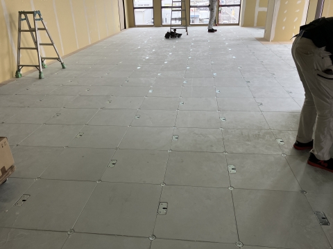 床は全面OAフロア仕様です。フロアタイルを設置する前に、それぞれの接続ポイントへLANケーブルを敷設します。