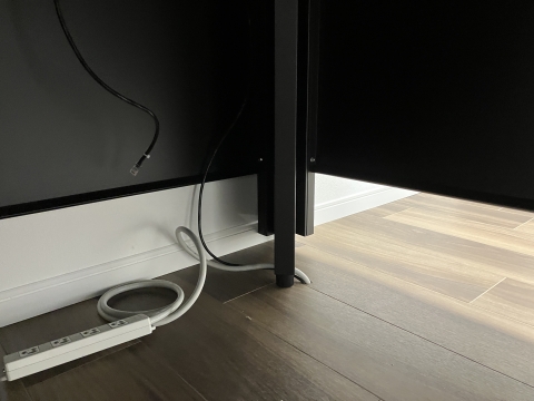 これは後日、タイルフロア(塩ビタイプ)が敷設された後の、配線取り出し口の様子です。電源タップとLANケーブルが同一箇所から床面に出ています。