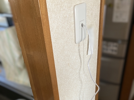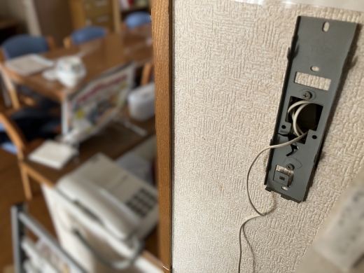 もともと壁掛けの電話機が設置されていましたが、故障したため置き型の電話機にケーブルを露出した状態で接続して利用されていました。